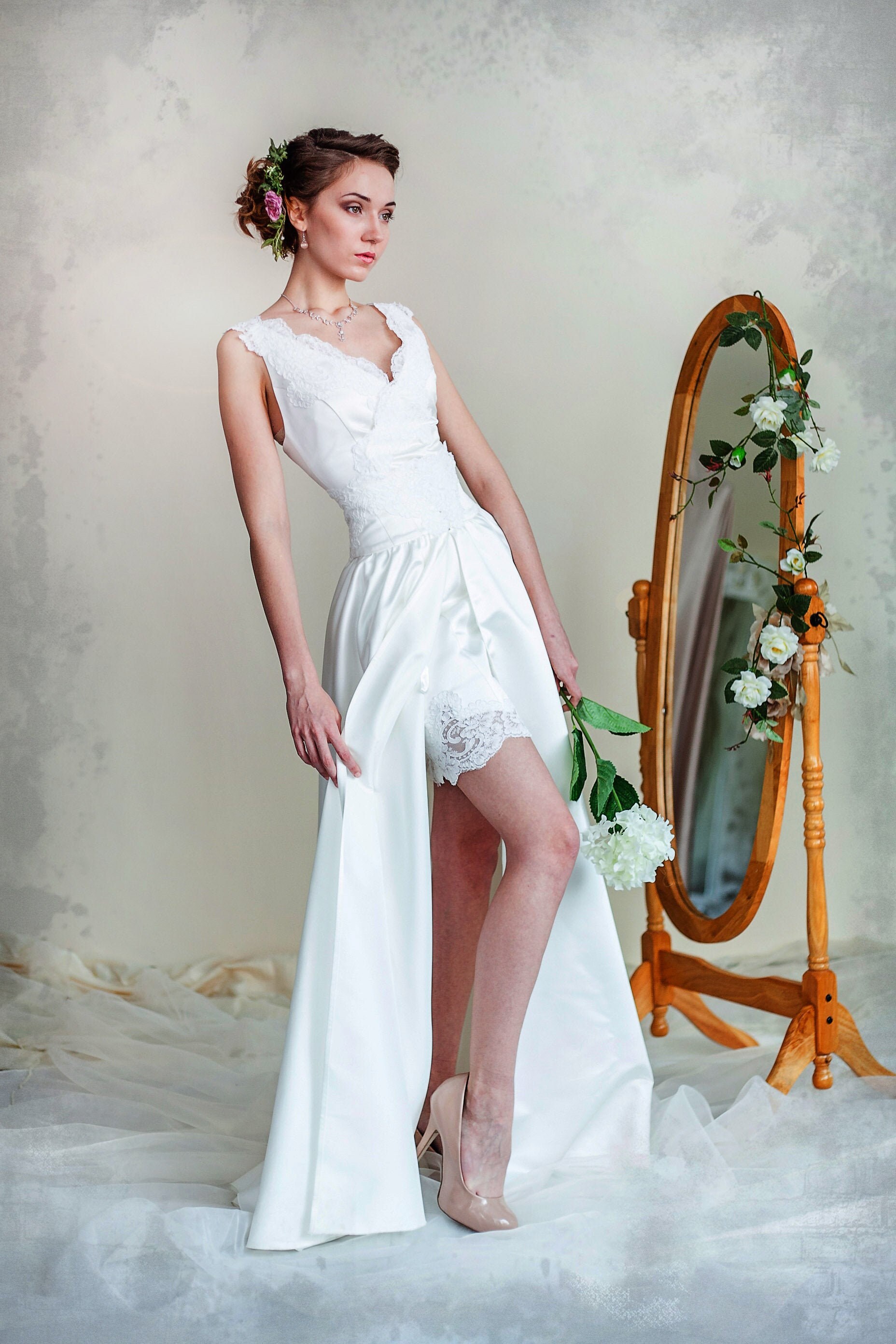 Sheath High Low Wedding Dress With Removable Skirt. The convertible aspect of the wedding gown can be a simple overskirt or overcoat, or as innovative as detachable components like sleeves or skirts. If you're on the hunt for a bold reception look, consider this gorgeous white lace romper with an overskirt.