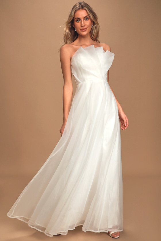 Stunning floral lace shapes wide, sheer straps, above a darted, sweetheart bodice with princess seams. Best Allover Lace: Lulus Ivory Lace Bell Sleeve Maxi Dress. Most people expect that wedding dresses will easily be hundreds or thousands of dollars, but at Lulus you get high quality clothing at a low cost.