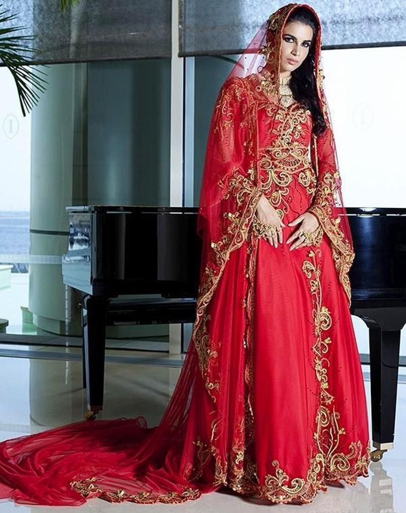 Muslim Wedding Dresses; Red Muslim Wedding Dress Satin A Line Bridal Dress Gown With Train prev next. Most brides opt for a red dress as it symbolizes wealth and happiness. The vibrant, attention grabbing red that makes people's eyes bleed hues of red are allowed because it gives the bride a royal look.