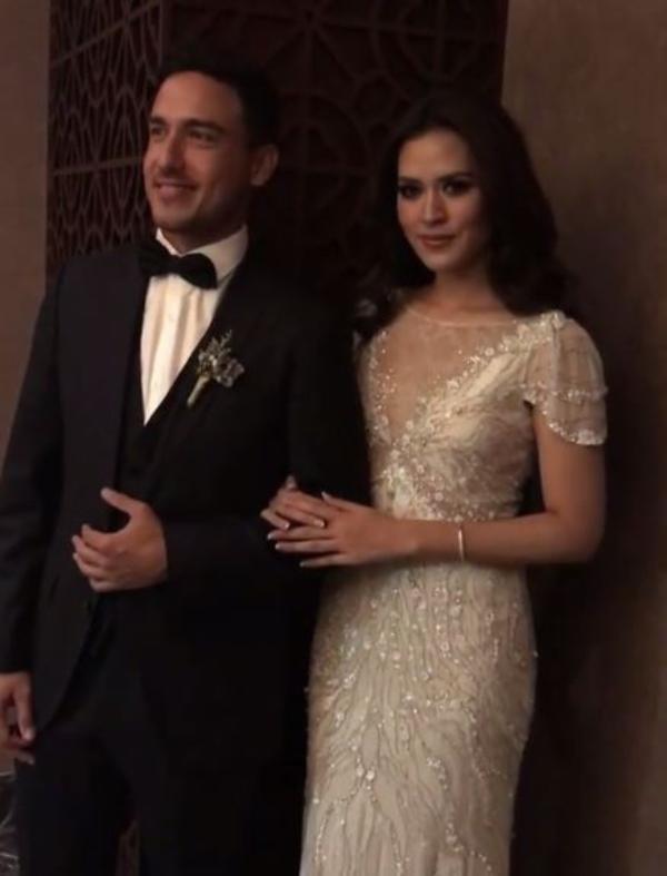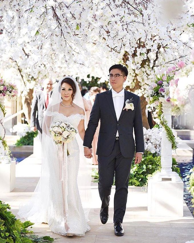 The precious lace details on the shoulders and back, and the Swarovski butterfly buttons confer elegance and romantism. Shown in ivory/nude, this spaghetti strap Rasia designer wedding dress features frosted, embroidered appliqués on an intricately designed crepe gown. This time, Raisa and Hamish changed from traditional Sundanese wedding attires into a mesmerizing wedding dress by ELIE SAAB Bridal by The Proposal and a suit from Hugo Boss.