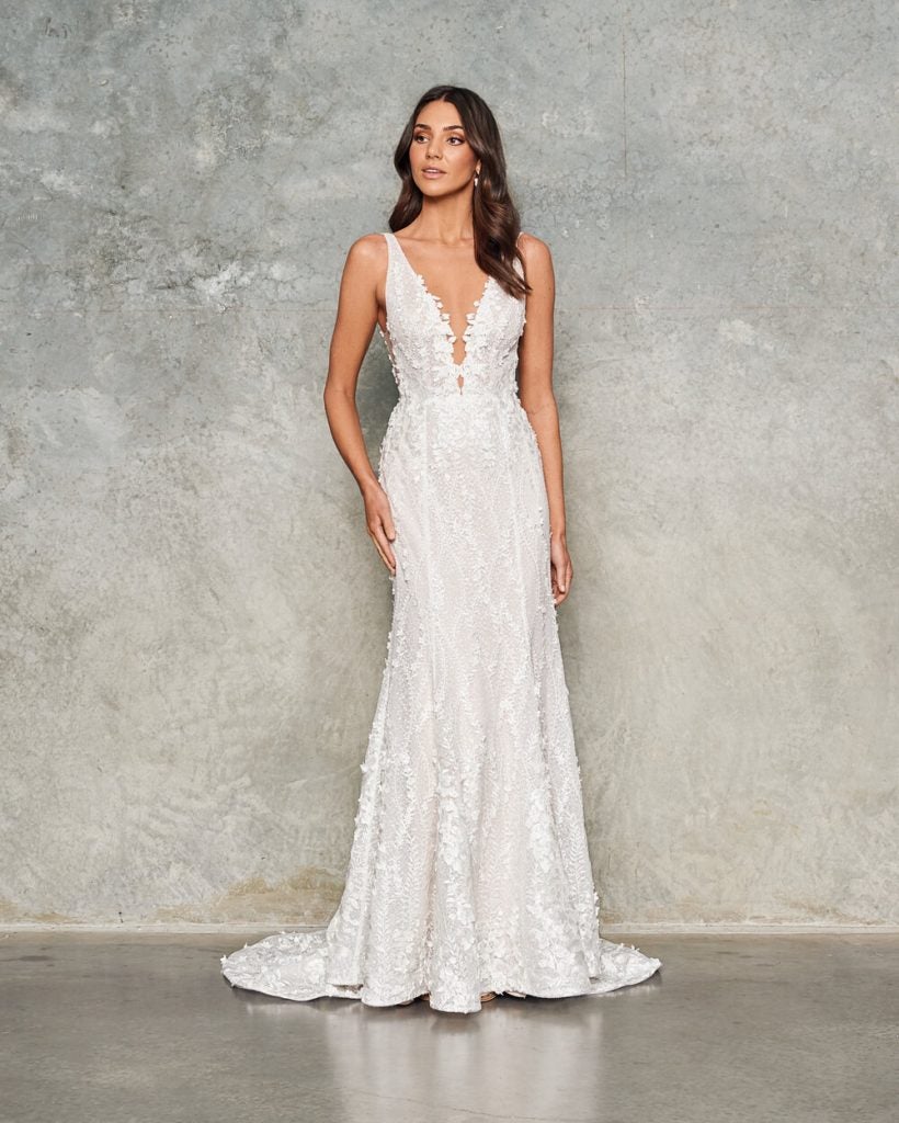 Leave it to Vera Wang to create the sleekest wedding day look for the modern bride. Buy : Giovani Wanda - White Embroidered V Neck Gown. Browse our collection of handmade, Australian V-neck lace wedding gowns.